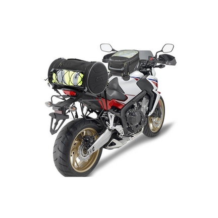 Sistema di attacco per mezzo di cinghie con doppi D-Ring sul fronte e sul retro della borsa e di una cinghia centrale di sicurezza alla base da inserire nel sottosella o sotto la coda.